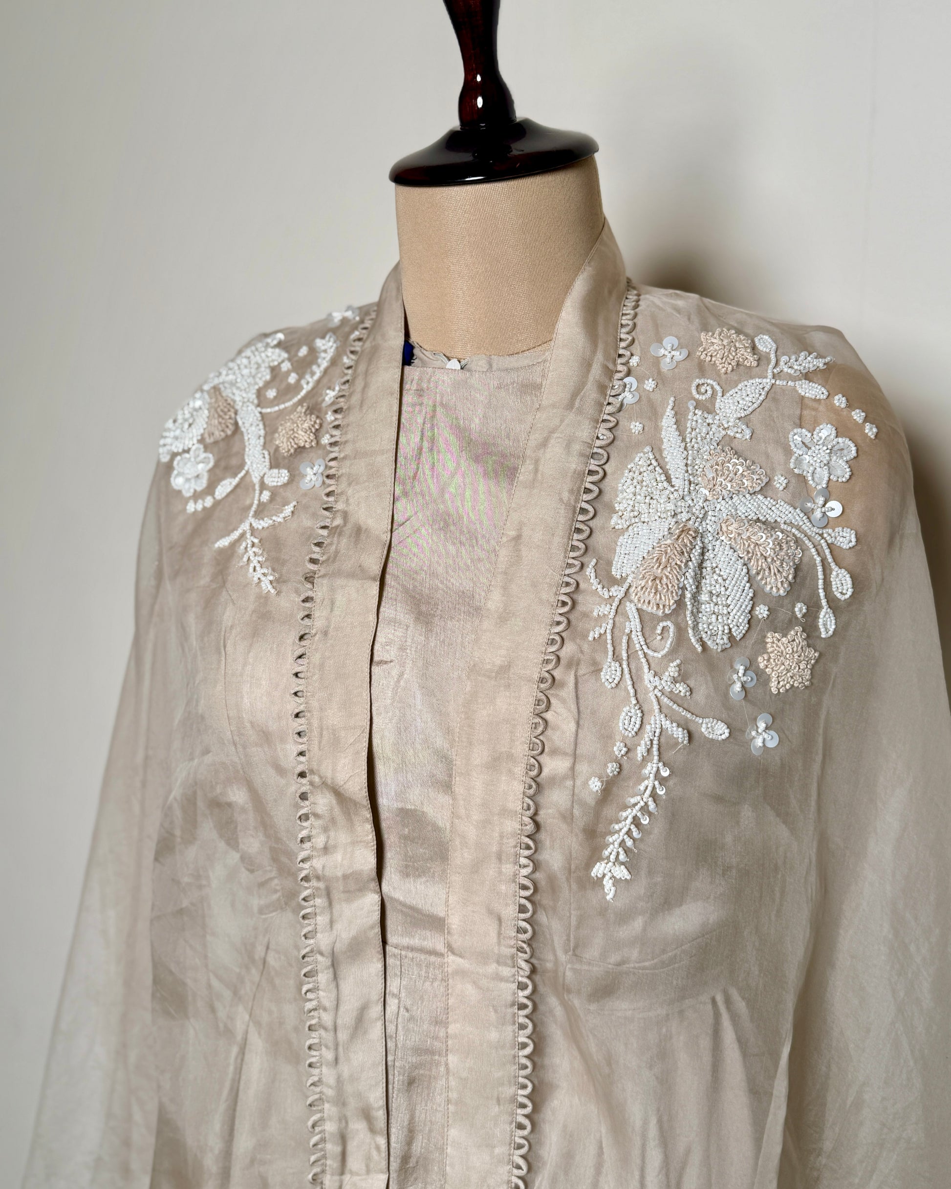 Crafted in luxurious pure tissue, this elegant beige-white ensemble exudes understated opulence and timeless grace. Adorned with intricate moti, thread, and sequin embroidery, it showcases refined craftsmanship with a delicate shimmer. The soft silk dress inside enhances comfort and structure, making it ideal for festive occasions, receptions, and elegant evening gatherings. Blending traditional artistry with modern sophistication, this piece radiates effortless elegance.