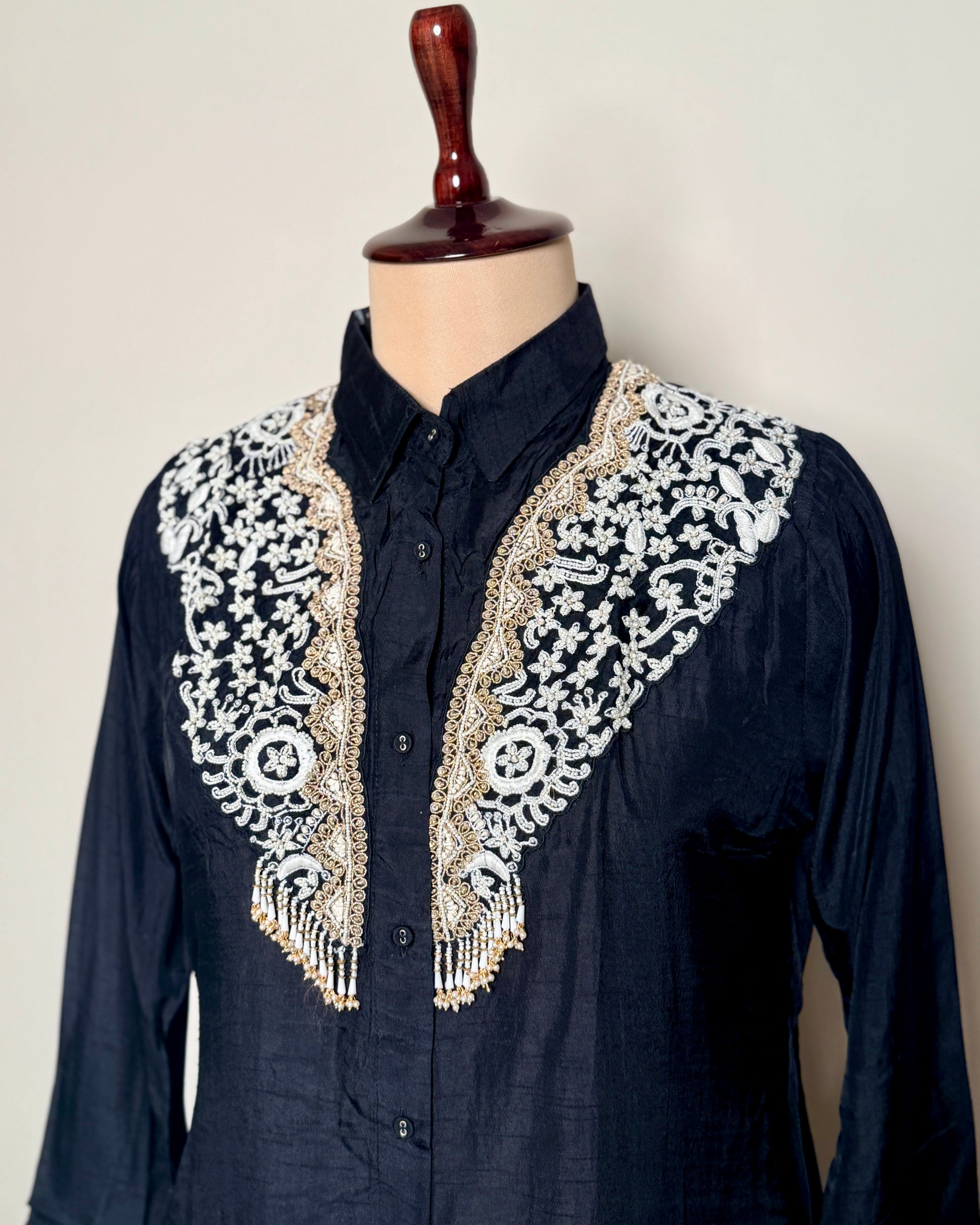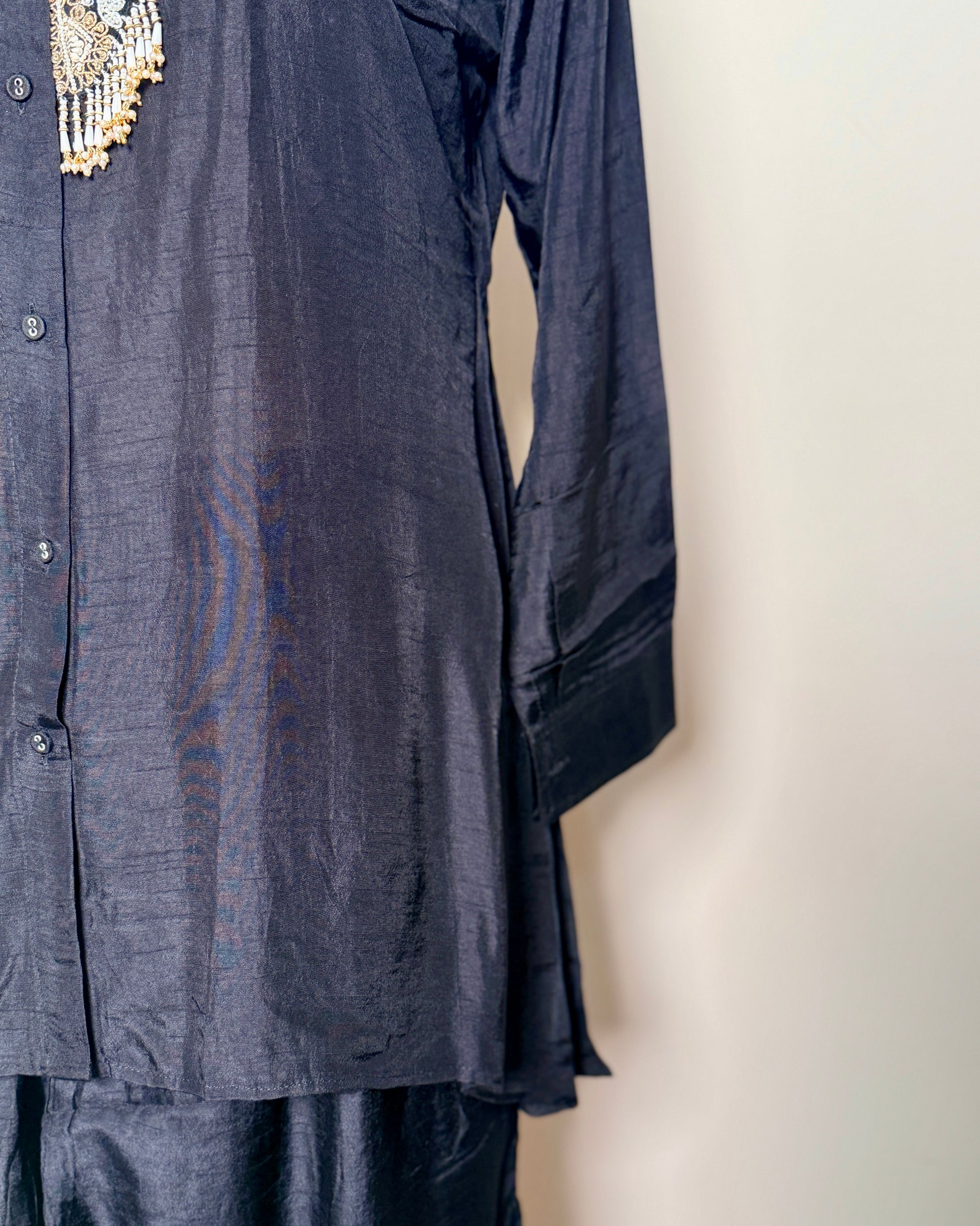 Crafted in luxurious satin silk, this elegant Black Indo-Western ensemble reflects timeless sophistication. Embellished with delicate Gotta, Moti, Sequin, and Thread work, the outfit radiates a subtle festive shimmer with a rich contemporary appeal. Perfect for receptions, cocktail evenings, and grand celebrations, it embodies classic refinement with modern grace.