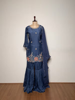 A blue silk sharara set adorned with timeless gotta handwork that shimmers with every movement. Rooted in tradition yet styled for the modern muse, it’s a celebration of festive elegance — effortless, radiant, and undeniably refined.