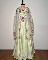 Crafted in soft chiffon silk, this elegant butter-yellow lehenga set radiates warmth and festive charm. Adorned with intricate appliqué embroidery, delicate sequin highlights, and refined spring and knot work, it reflects a perfect blend of craftsmanship and sophistication. The fluid drape and luminous hue make it an exquisite choice for weddings, festive occasions, and elegant celebrations.
