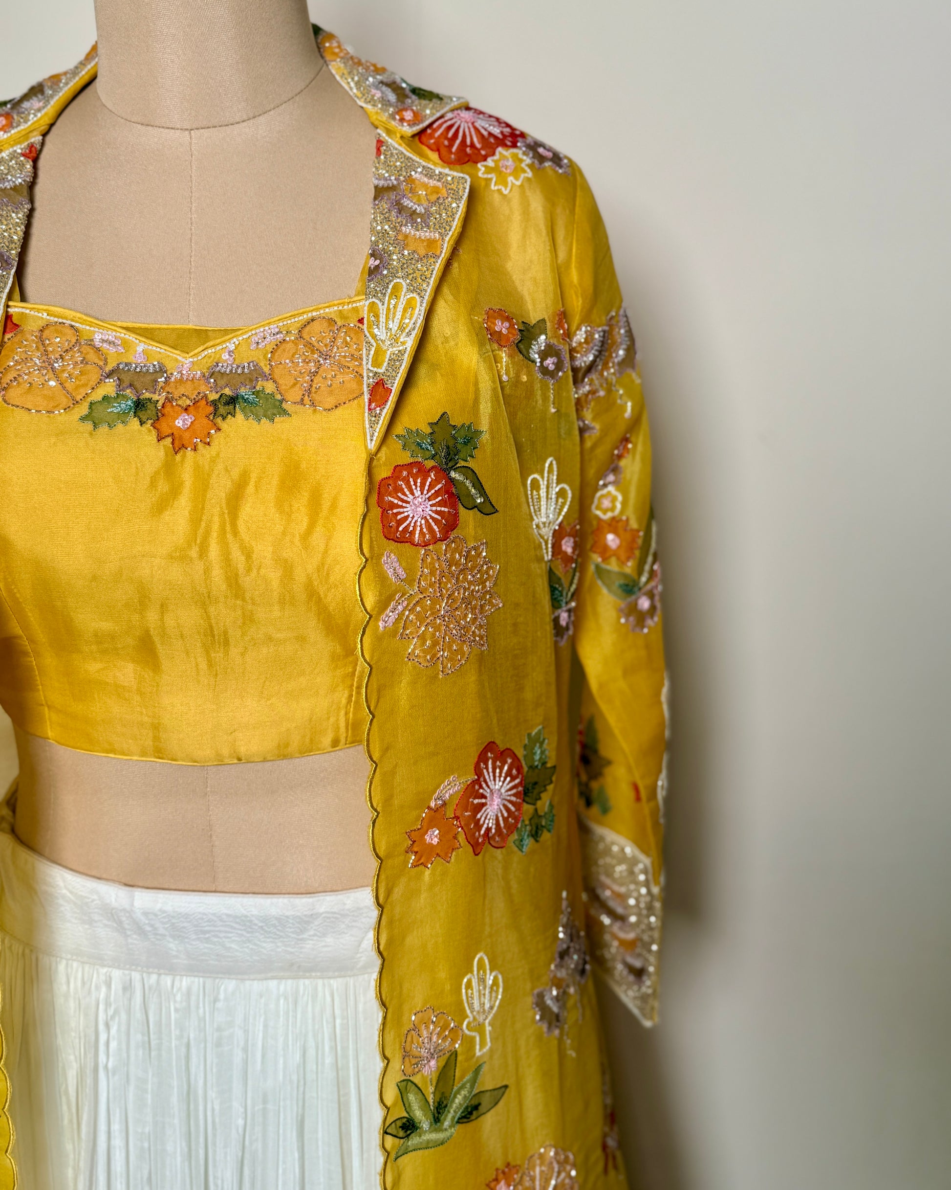 Crafted in soft chiffon silk, this elegant butter-yellow lehenga set radiates warmth and festive charm. Adorned with intricate appliqué embroidery, delicate sequin highlights, and refined spring and knot work, it reflects a perfect blend of craftsmanship and sophistication. The fluid drape and luminous hue make it an exquisite choice for weddings, festive occasions, and elegant celebrations.