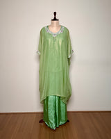 Crafted in net silk, this graceful green ensemble features a beautifully embroidered kurti paired with elegant silk palazzo pants. Adorned with intricate thread, golden zari, and delicate spring work, the outfit reflects refined craftsmanship and timeless charm. Perfect for festive occasions, intimate gatherings, and elegant daytime celebrations, it blends sophistication with effortless ease.