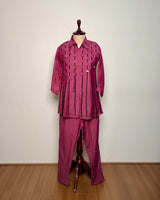 Crafted in lightweight mul chanderi, this elegant magenta pink co-ord set radiates effortless charm and contemporary grace. The top features a subtle string pattern that adds texture and movement to the soft fabric, creating a refined yet modern silhouette. Perfect for festive brunches, daytime gatherings, and elegant occasions, it blends traditional fabric with a relaxed, sophisticated design.