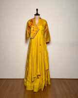 Crafted in luxurious pure silk, this elegant mustard yellow gown is a perfect blend of traditional artistry and contemporary design. Featuring a sophisticated crossover pattern accentuated with intricate Zardosi, golden zari, and knot work, it exudes refined opulence. The subtle hand-painted print adds an artisanal charm, creating a harmonious balance of texture and craftsmanship. Ideal for weddings, festive soirées, and grand celebrations, this gown radiates regal elegance with a modern touch.