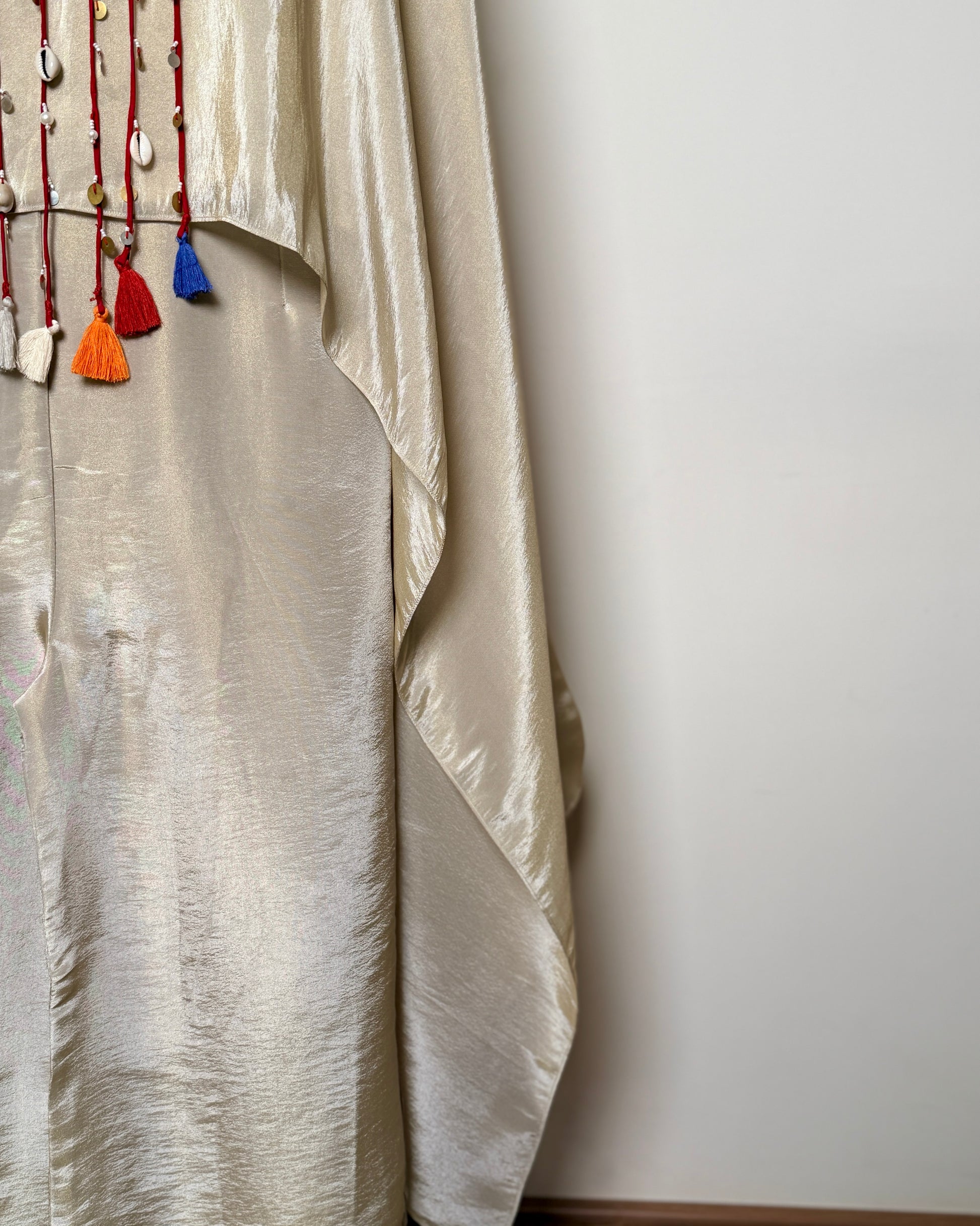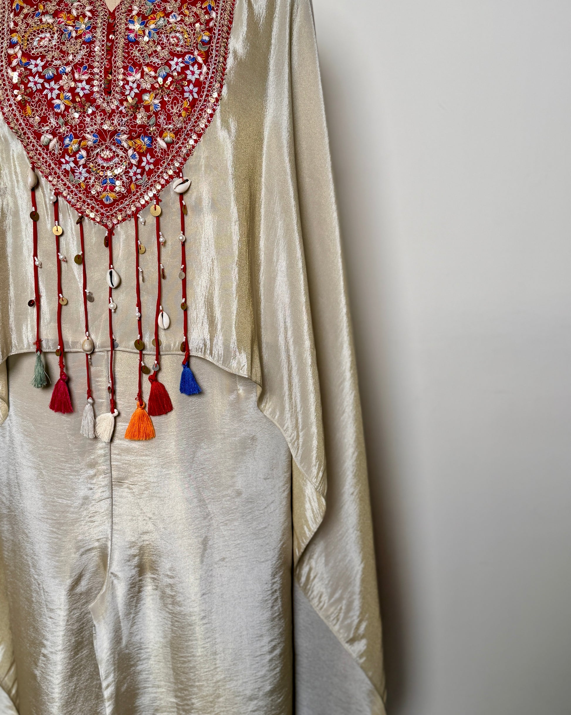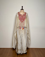 Crafted in luxurious pure silk, this off cream-white ensemble exudes timeless sophistication. Detailed with fine thread embroidery, golden zari accents, and delicate spring work, it captures the essence of understated opulence. Perfect for festive occasions, receptions, and elegant gatherings, this piece reflects effortless grace and refined charm.