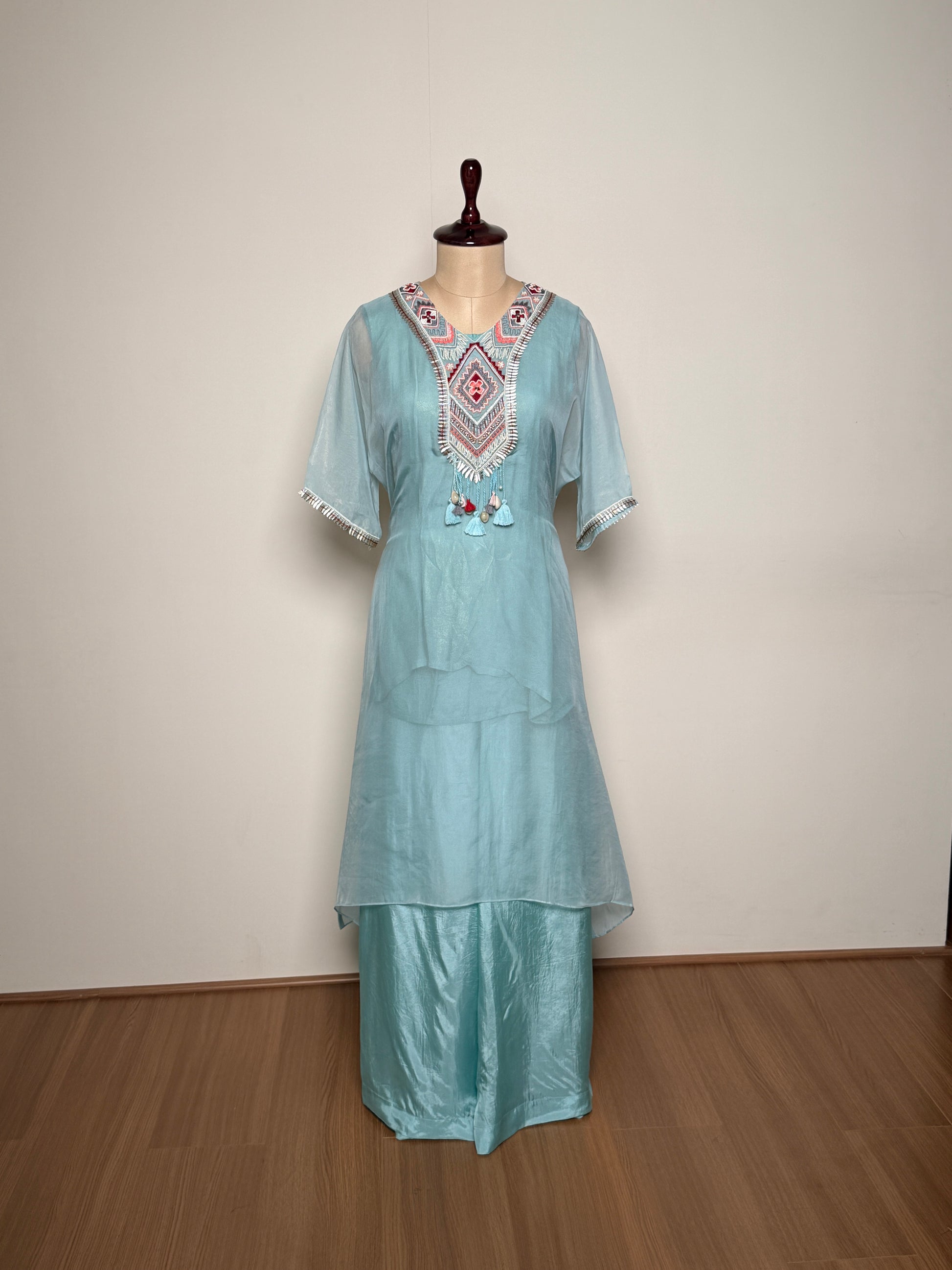 Crafted in soft chiffon, this elegant pastel blue kurti is paired with smooth silk palazzo pants for a refined and graceful silhouette. The ensemble is beautifully adorned with intricate Aari, Moti, Spring, and Thread embroidery, showcasing exquisite detailing and delicate craftsmanship. Perfect for festive gatherings, daytime celebrations, and elegant occasions, it embodies effortless sophistication with a serene, modern charm.