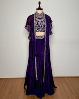 Crafted in soft pure chiffon, this purple Indo-Western ensemble features heavy Zardosi work that exudes elegance. It includes a fitted blouse, flared palazzo pants, and a flowing cape, combining traditional craftsmanship with contemporary design — ideal for festive occasions and grand celebrations.