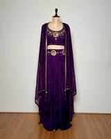 Crafted in rich silk, this regal purple Indo-Western ensemble blends traditional artistry with modern sophistication. The silk blouse and dhoti are beautifully embellished with golden sequin and zari embroidery, radiating festive elegance. A flowing chiffon cape drapes gracefully over the silhouette, highlighted with delicate golden sequin detailing that adds a luminous charm. Perfect for weddings, receptions, and grand celebrations, this outfit embodies effortless glamour and timeless appeal.