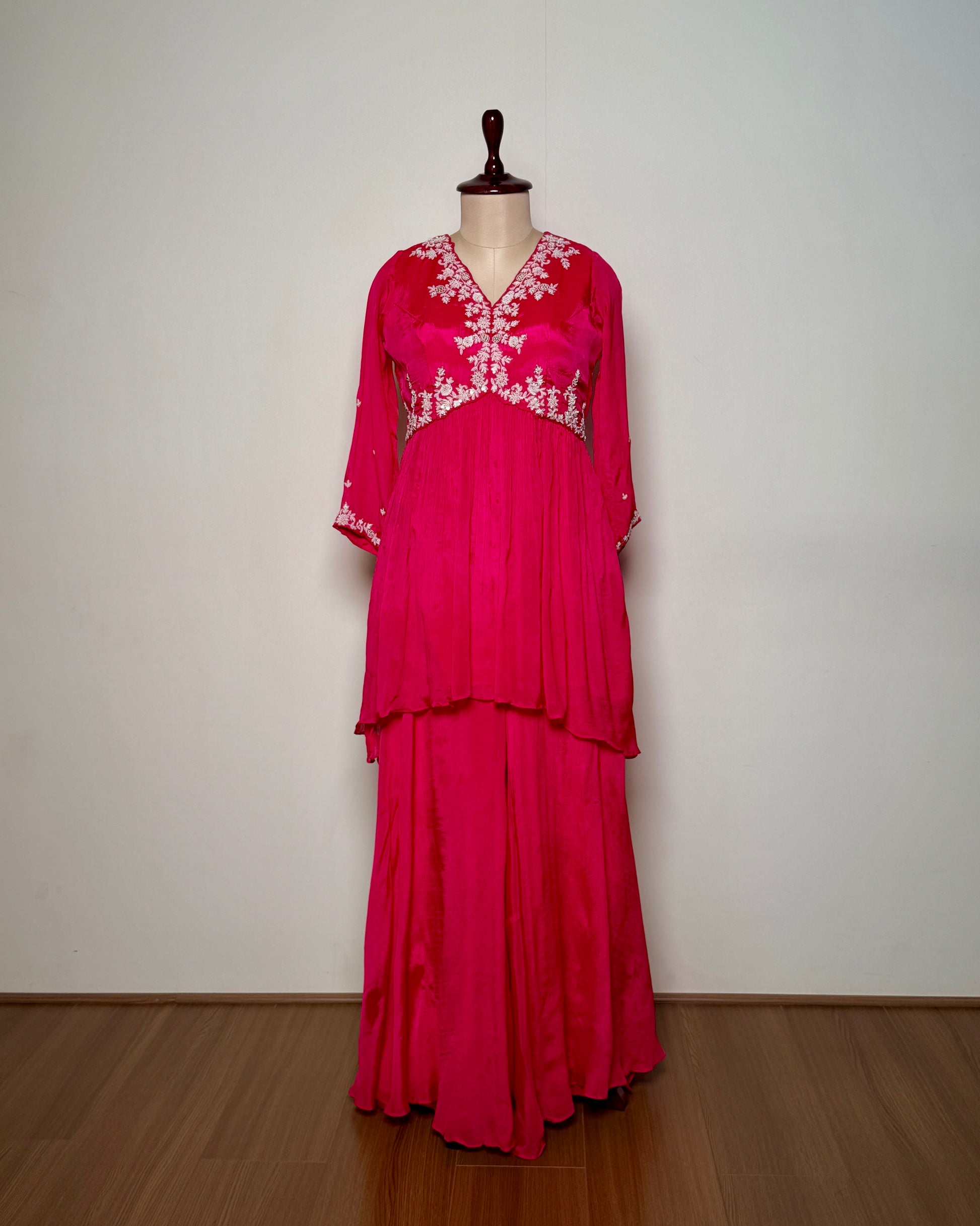 Crafted in luxurious silk, this radiant rani pink Indo-Western ensemble captures the essence of festive sophistication. Adorned with intricate thread embroidery, delicate moti embellishments, and shimmering sequin work, it’s finished with refined piping details that enhance its structured silhouette. Perfect for weddings, receptions, and elegant festivities, it blends traditional craftsmanship with a vibrant, modern appeal.
