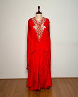 Crafted in luxurious crepe silk, this elegant red Indo-Western ensemble radiates festive sophistication. Detailed with intricate Aari and Moti embroidery, complemented by subtle thread work, the outfit captures the perfect harmony of tradition and modern refinement. Ideal for weddings, receptions, and grand celebrations, it exudes timeless charm and regal poise.